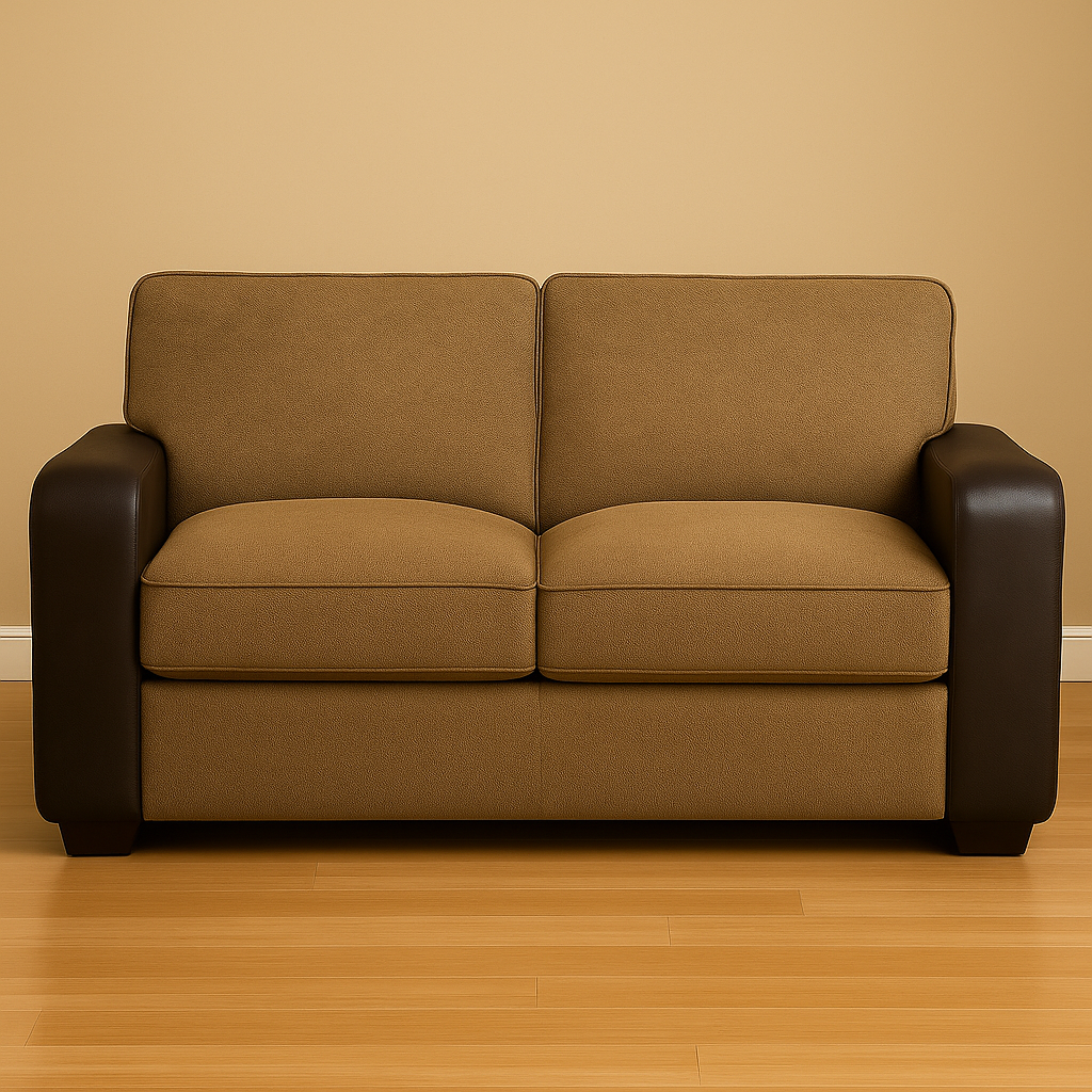The Aspen Retreat two-seater sofa blends elegance and comfort with its rich leatherite arms and soft beige fabric. The two-tone design adds visual appeal, while plush seats provide a cozy, inviting feel—perfect for any stylish living space.