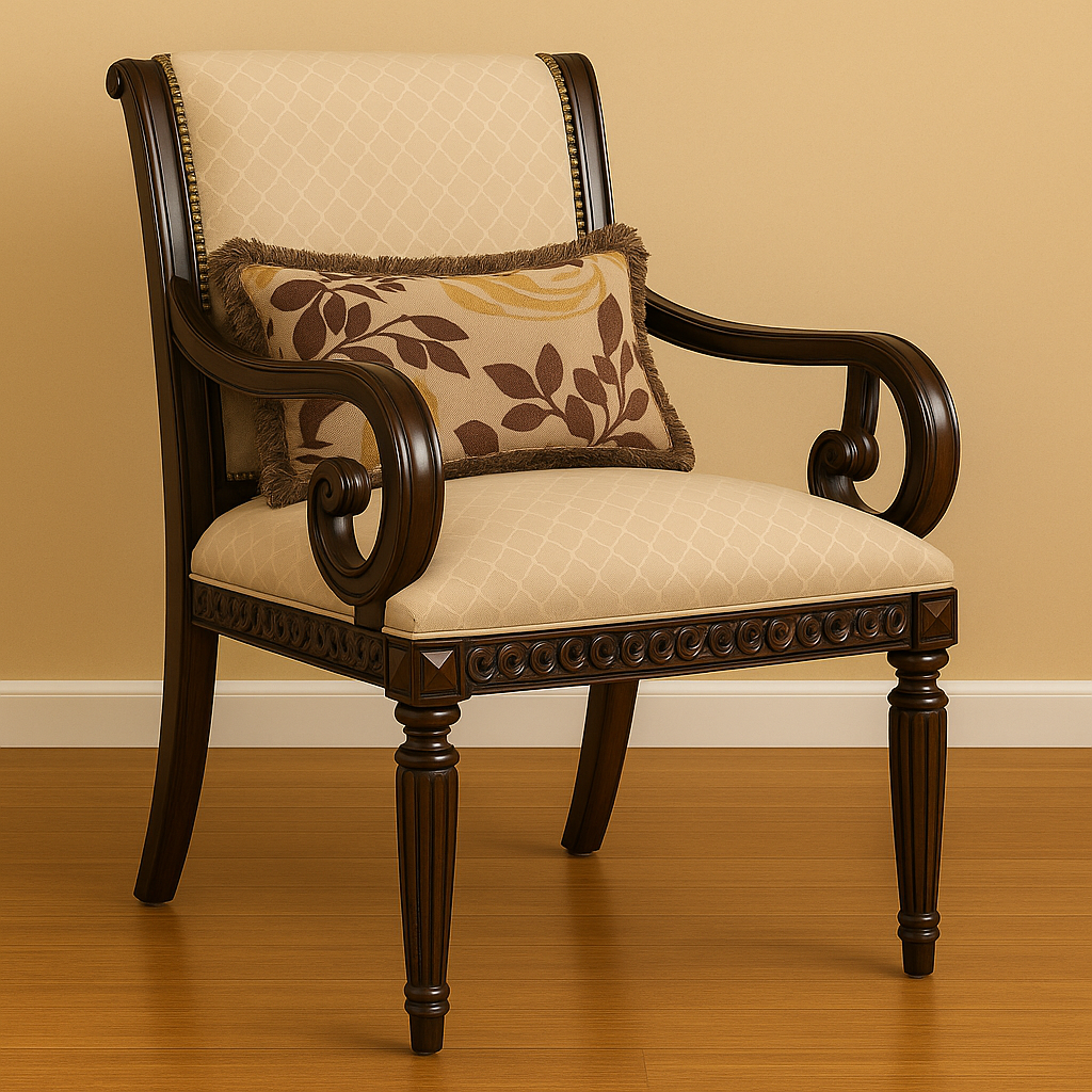 The Breeze chair is a masterpiece, beautifully crafted from rich rosewood to create a timeless appeal. Its striking round carvings on the legs and base panel add intricate detail, enhancing its beauty and charm. The gently rounded arms provide a comfortable, inviting touch, while the soft beige upholstery adds warmth and elegance to the piece. Perfectly balancing sophistication and comfort, the Breeze chair is an exquisite addition to any room, offering both style and relaxation