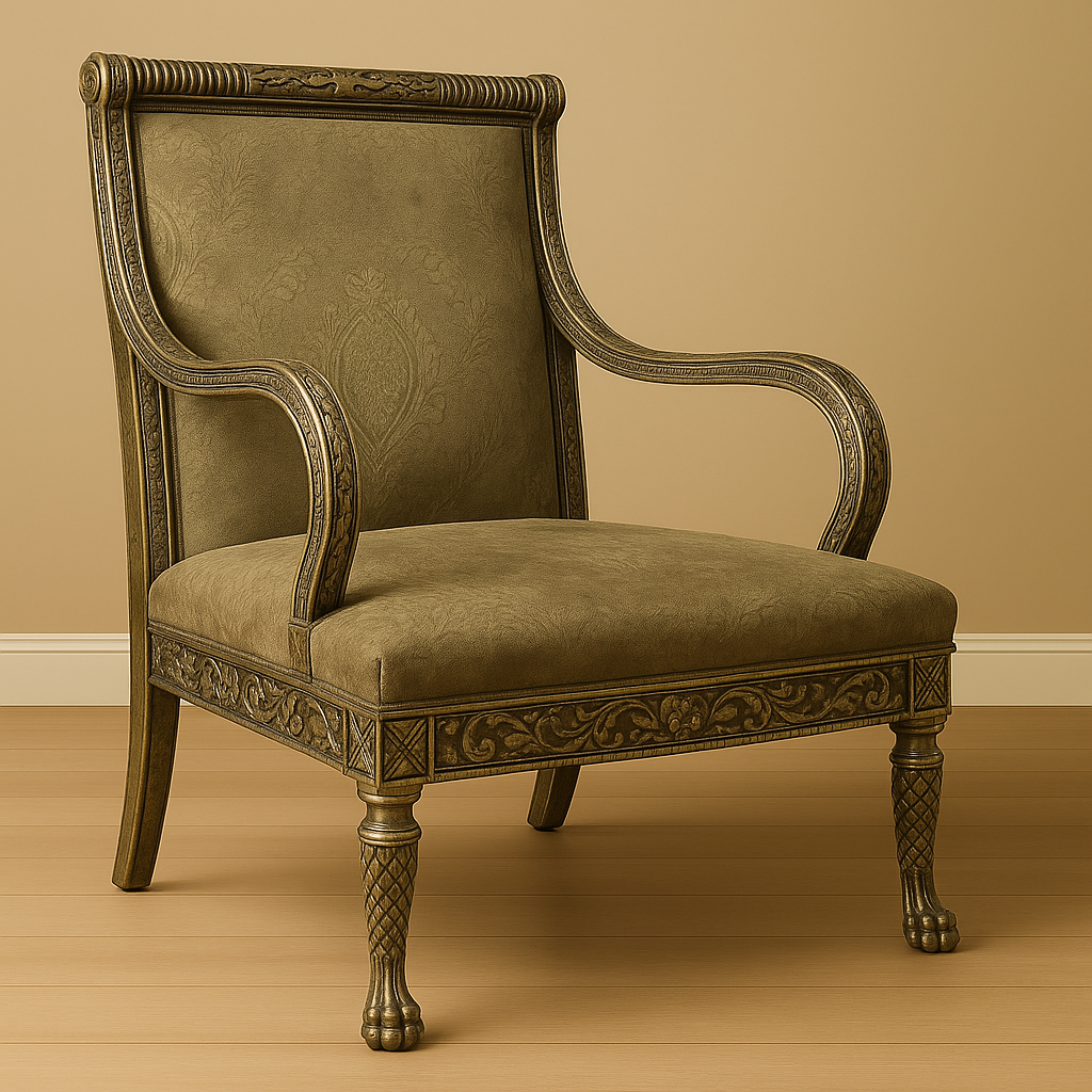The Goldee chair is beautifully crafted from fine rosewood with intricately detailed carvings on the legs, arms, and both the front and back panels, exuding a rich, royal look. The elaborate carvings create a sense of opulence, with every curve and detail carefully sculpted to perfection. The seat and back are upholstered in a sophisticated dull gold fabric, adding a soft, understated elegance that complements the intricate woodwork. The arms, delicately designed in large circular shapes, provide both visual allure and comfort. This chair is a visual masterpiece, offering a striking combination of grandeur and refinement that makes it a truly regal addition to any room.