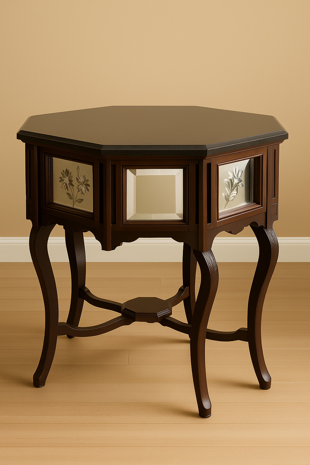 Orla is a delicate yet striking table that marries elegance with modern flair. Its supporting structure, crafted from rich rosewood, is thoughtfully designed in a graceful Victorian style, adding a touch of vintage charm to any room. The hexagonal shape of the table is both unique and sophisticated, finished in a deep, dark brown that enhances the natural beauty of the wood. The striking black granite tabletop offers a sleek contrast, its smooth surface exuding both durability and luxury. Adding an extra layer of artistry, the sides of the table are decorated with intricately cut-glass mirrors, reflecting light and elevating its overall elegance. Orla is a perfect statement piece that blends timeless craftsmanship with contemporary design elements.