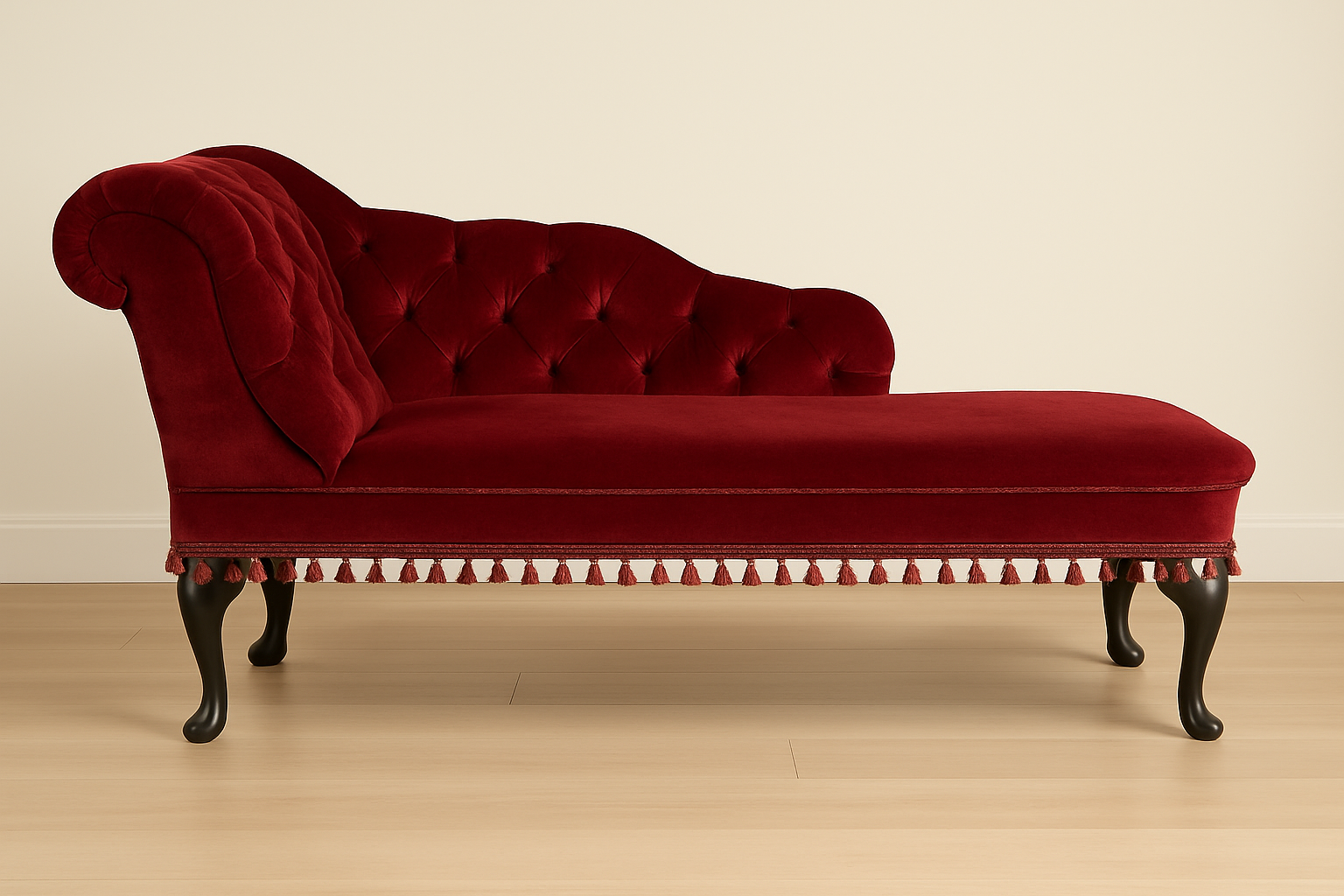 The Simplicity Settee is a traditional design with modern comfort. Upholstered in red velvet fabric. It offers Victorian style rose wood legs polished in dark brown polish.