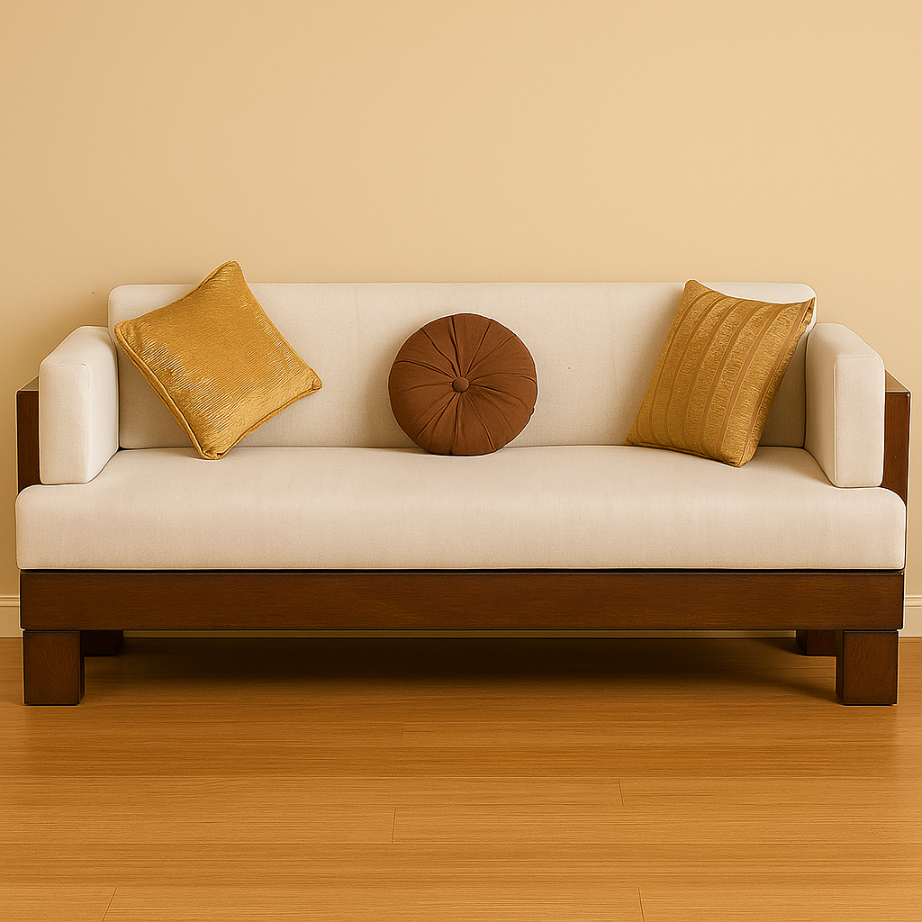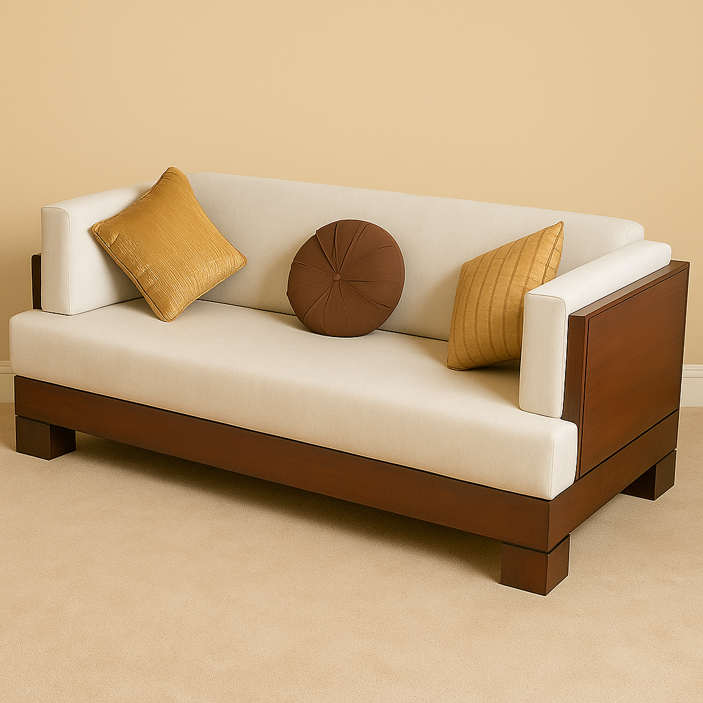 The Velora two-seater sofa combines strong, minimalist design with exceptional comfort. Featuring heavy side arms that add a touch of sophistication and structure, the sofa is built with a sturdy, box-like wooden frame that ensures durability and a clean, modern look. Upholstered in a warm camel-coloured fabric, the Velora exudes both style and versatility, seamlessly fitting into any interior.